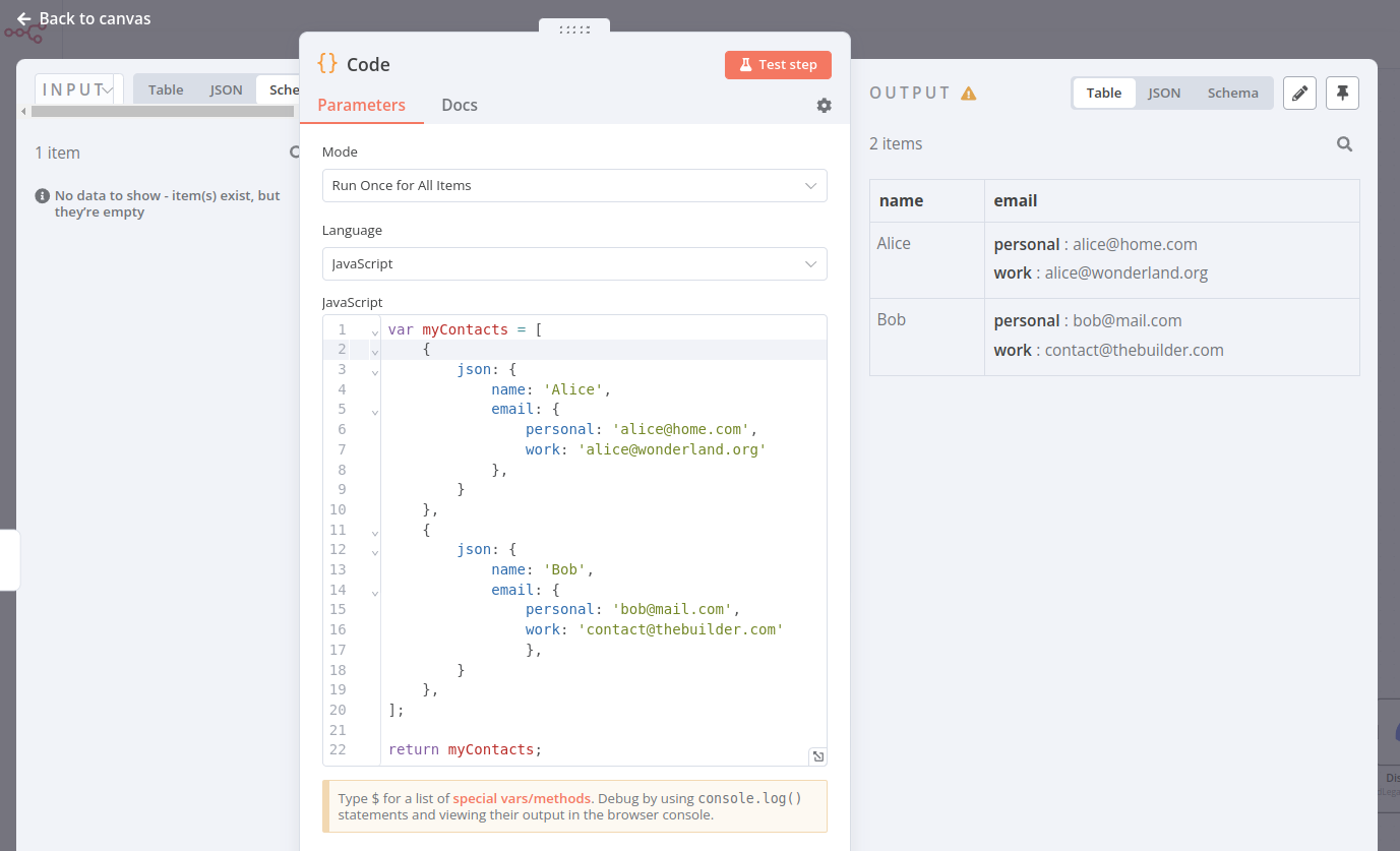 In a Code node, create an array of objects named myContacts that contains the properties name and email, and the email property is further split into personal and work.