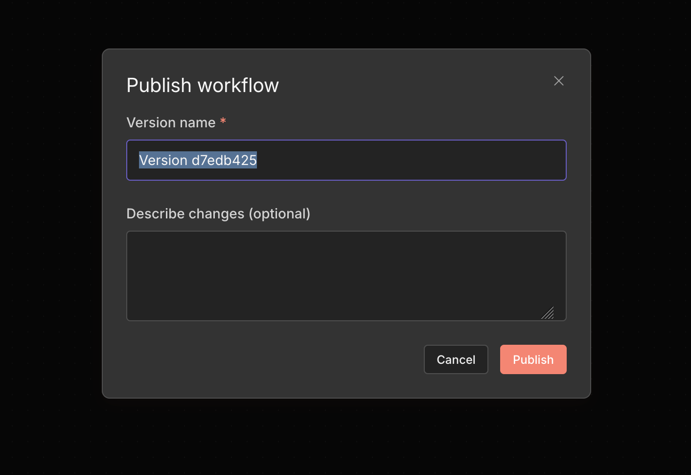 Shift+p) to open the publishing modal - The version name defaults to a UUID. Customize the name if you'd like and add a description of the version.